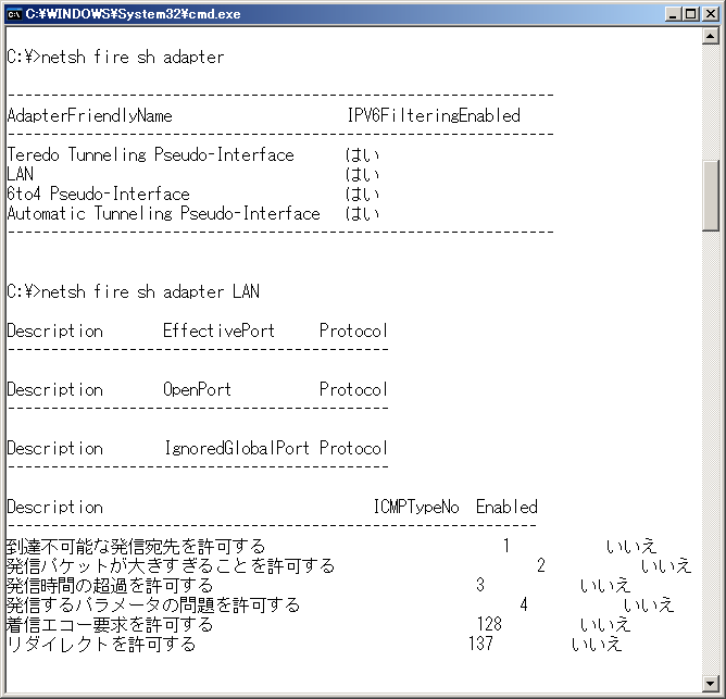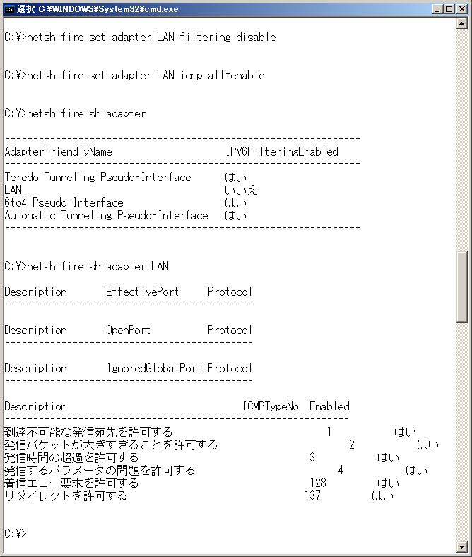Windows XpのIPv6でpingが失敗するときは…firewall設定Windows Updateとservice Pack2003年の7月に脆弱性としてMicrosoftが発表していたにもかかわらず、一ヵ月後の8月にMSBlasterが大発生した。このことを教訓としてMicrosoftはデフォルトセキュアーの一環で、FirewallをデフォルトONに設定した。Windows Updateをまめに適用していても、filtering設定だけでなく ICMP設定がデフォルトでかかるようになった。Windows Xpを2004年04月14日現在の最新状態にすると、次のコマンドを実行して設定変更しないとpingが失敗する。
